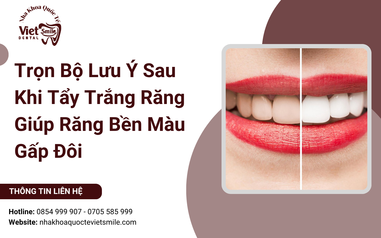 Tẩy trắng răng là phương pháp nhanh chóng và hiệu quả để sở hữu một nụ cười trắng sáng, rạng rỡ. Tuy nhiên, hiệu quả tẩy trắng tại nha khoa chỉ là 50% của quá trình, 50% còn lại phụ thuộc hoàn toàn vào chế độ ăn uống và cách bạn chăm sóc răng tại nhà. Việc tuân thủ nghiêm ngặt các lưu ý sau khi tẩy trắng răng chính là "chìa khóa vàng" giúp duy trì kết quả trắng sáng lâu dài. Trong bài viết này, Nha khoa Quốc tế Việt Smile sẽ đưa ra những hướng dẫn chi tiết mà bạn nhất định phải biết.